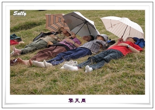 走著走著,看到和老爺夫人有志一同的人,一人一把傘,排排睡在草原上