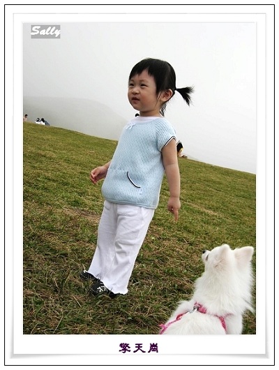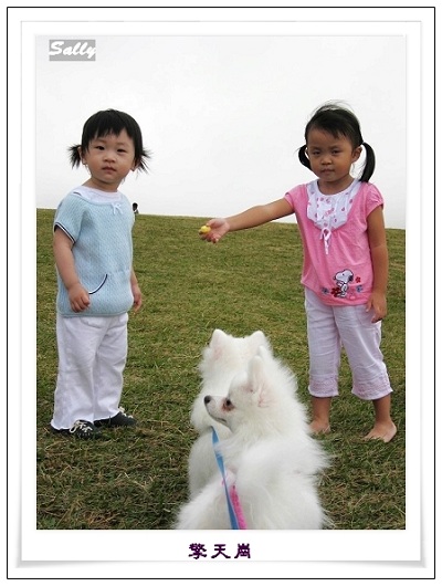 後來又來了藍衣妹妹.藍衣妹妹看著四隻狗狗,一隻一隻的比著說"旺旺", "旺旺",他的年紀比較小,但是似乎比粉紅小姊姊膽子大一點,一直往前靠近,擔心妹妹被嚇著.只派出最小隻的ㄋㄟㄋㄟ和球球跟他們玩