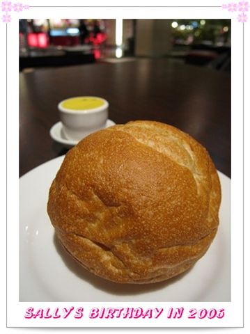 接著,是這個圓滾滾的麵包,附上大蒜酱,麵包很酥脆,很好吃,但是我卻麵包屑掉了滿桌...不過真的好好吃喔
